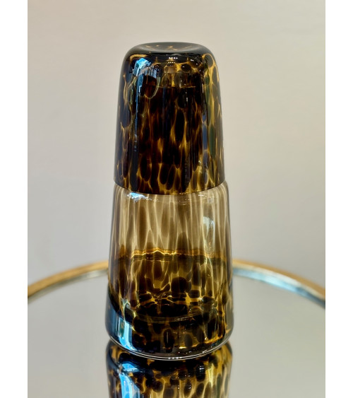 Service de nuit moucheté léopard en verre, pratique et élégant. Composé d'une carfe et d'un verre assorti, il allie fonctionnalité et design.