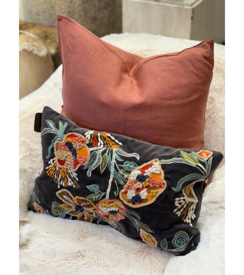 Housse de coussin en velours brodée main 30x50 cm - Anthracite et fleurs multicolores