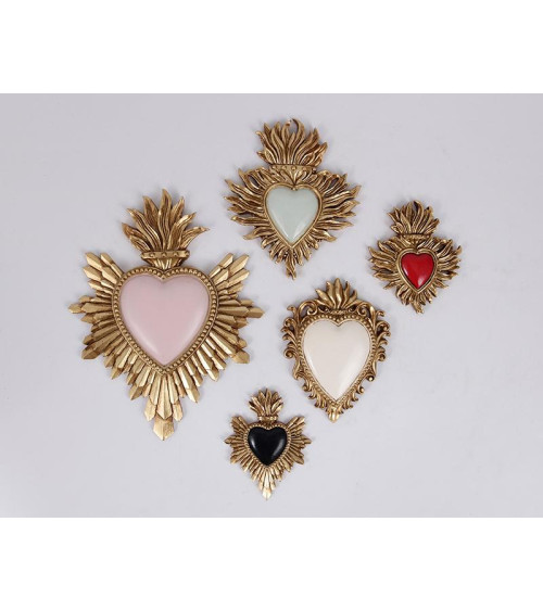 Apportez une touche d'élégance et de spiritualité à votre intérieur avec cet Ex-Voto mural. Son design raffiné, mêlant le rose pâle délicat et le doré scintillant en fait un objet de décoration unique.Le coeur sacré, symbole d'amour et de dévotion, est surmonté d'une flamme, ajoutant une dimension mystique à l'ensemble. Parfait pour habiller vos murs avec style, cet Ex-Voto est un véritable bijou décoratif.