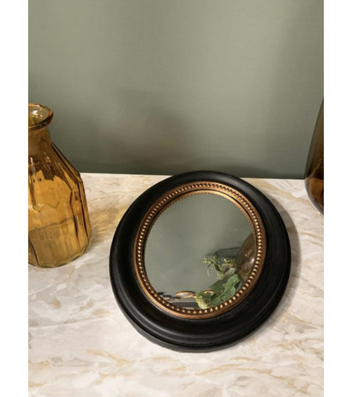 Ce miroir convexe ovale noir et doré de format compact est une pièce décorative idéale pour apporter du caractère, de la profondeur et une touche élégante à votre intérieur. Facile à intégrer, il s’adapte à tous les styles et trouve sa place aussi bien en décoration murale qu’en objet posé.