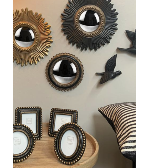 Son cadre décoratif en forme de fleur aux finitions dorées et noires crée un contraste élégant qui s’intègre parfaitement dans différents styles de décoration : vintage, classique, baroque, chic ou encore décoration murale moderne. Grâce à son miroir bombé, il reflète la lumière et les formes d’une manière artistique, apportant profondeur et dynamisme à votre mur.