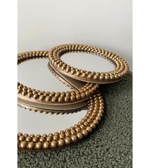 Le cadre de ce miroir se distingue par son travail minutieux : une triple rangée de perles en relief à la finition dorée antique. Cette teinte chaude et lumineuse s'intègre parfaitement dans tous les styles d'intérieurs, du style bohème chic au design classique en passant par une ambiance art déco. Sa petite taille de 14,5 cm en fait un élément polyvalent, facile à placer dans une entrée, un salon ou une chambre.